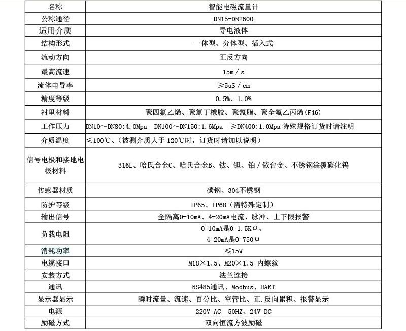 ●仪表结构简单、可靠,无可动部件,工作寿命长。 ●无截流阻流部件,不存在压力损失和流体堵塞现象。 ●无机械惯性,响应快速,稳定性好,可应用于自动检测、调节程控系统。 ●测量精度不受被测介质的种类及其温度、粘度、压力等物理量参数的影响。 ●励磁线及电极线均采用优质的单芯屏蔽线,可降低干扰,提高信号的洁净度,从而提高测量精度。 ●具有双向流量测量,双向总量累计功能,内部具有三个积算器可分别显示正向累积值,反向累积值及差值积算量。 ●全数字量处理,抗干扰能力强,测量可靠。 ●中英文菜单操作,使用方便,操作简单,易学易懂。 ●使用智能化判断,不采用测量修正设置,空管报警与电极检测应用更加便捷。 ●用AD421电流专用芯片使得4-20mA电流输出更加稳定。