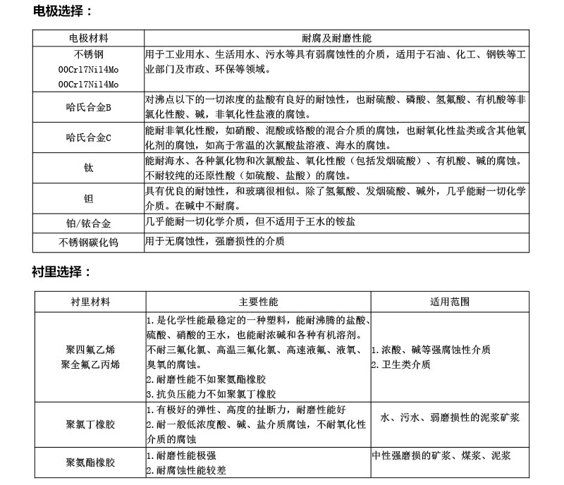 采用聚四氟乙烯或橡胶材质衬里和HC、HB、316L、钛等电极材料的不同组合可使用不同介质的需要