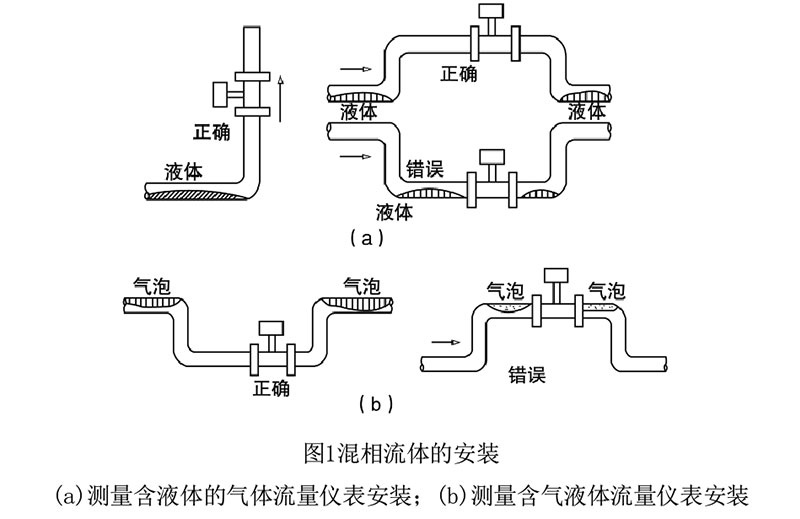 安装注意事项 涡街流量计属于对管道流速分布畸变、旋转流和流动脉动等敏感的流量计,因此, 对现场管道安装条件应充分重视,遵照生产厂使用说明书的要求执行。涡街流量计可安装在室内或室外。如果安装在地下井里,有水淹的可能,要选用潜 水型传感器。传感器在管道上可以水平、垂直或倾斜安装,但测量液体和气体时为防止 气泡和液滴的干扰,安装位置要注意,如图1所示。
