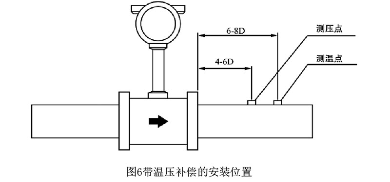 电气安装应注意传感器与转换器之前采用屏蔽电缆或低噪声电缆连接,其距离不应 超过使用说明书的规定。布线时应远离强功率电源线,尽量用单独金属套管保护。应遵 循“一点接地”原则,接地电阻应小于10Ω。整体型和分离型都应在传感器侧接地,转 换器外壳接地点应与传感器“同地”。带温压补偿时安装位置,如图6所示。
