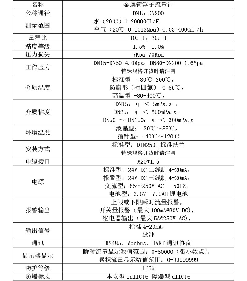 金属管浮子流量计是工业自动化过程控制中常用的一种面积流量测量仪表。它具有体积小,检测范围大,使用方便等特点。它可用来测量液体、气体以及蒸汽的流量,特别适宜低流速小流量的介质流量测量。 流量计主要有三大部分组成:1.测量管体;2.锥形浮子;3.指示器。浮子的位移量与流量大小成正比,通过磁耦合系统,以不接触方式,将浮子位移量传给指示器指出流量大小。也可配合不同的转换器,将流量值转换成标准的电远传信号如4-20mA。实现距离远传显示、记录、积算和控制等功能。具有独特的双指示系统,双行液晶数字显示,耐高温高压。