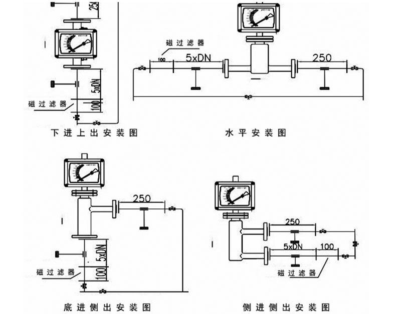 5.若介质中含有固体杂质,应在阀门和直管段间加装过滤器;若介质中含有铁磁物质,应在流量计上游安装磁过滤器。