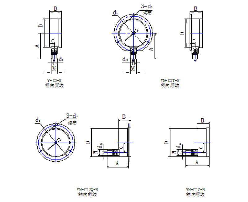 连接形式 M20×1.5 或 1/2 NPT 底部连接,或背部连接(径向全不锈钢压力表/轴向全不锈钢压力表)