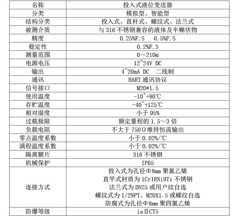 ●投入式、直杆式、法兰式、螺纹式结构设计 ●安装简单、使用方便、互换能力强。高品质传感器的灵敏度高,响应速度快,准确反映流动或静态液面的细微变化,测量准确度 ●备有防阻塞型设计,可实现对糊状介质液位的测量 ●4~20mA DC标准电流信号输出,二线制工作,抗干扰能力强 ●100%等分刻度、LCD、LED三种指示表头,现场读数十分方便 ●精细独特的零点、温漂、非线性补偿,保证仪表使用条件范围内的精度长期稳