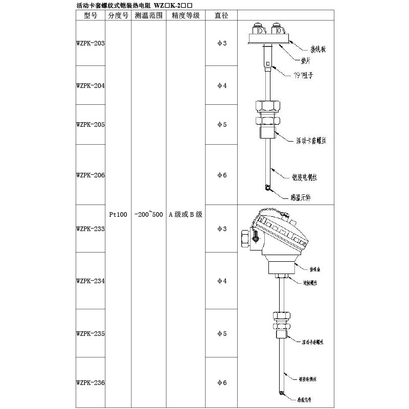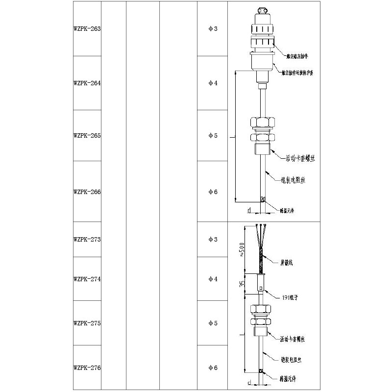 铠装热电阻的结构,除五部中的测温元件、绝缘材料、保护套管三部分构成铠材整体以外,其余与常规热电阻的结构相同。铠材(测温元件、绝缘材料 、保护套管):测温元件对热电阻来说是感温元件及其内引线;各热电阻引线之间,及其与保护套管之间用氧化接作绝缘材料;用金属管保护绝缘材料和测温元件。铠材工艺使测温元件、绝缘材料、保护套管三者成为一个不可拆卸的可挠的紧密实体,铠材是制造铠装热电阻的基体材料, 铠材不能直接用于测温,必须制作测量端和简易接线端后方可作为基型铠装热电阻使用。