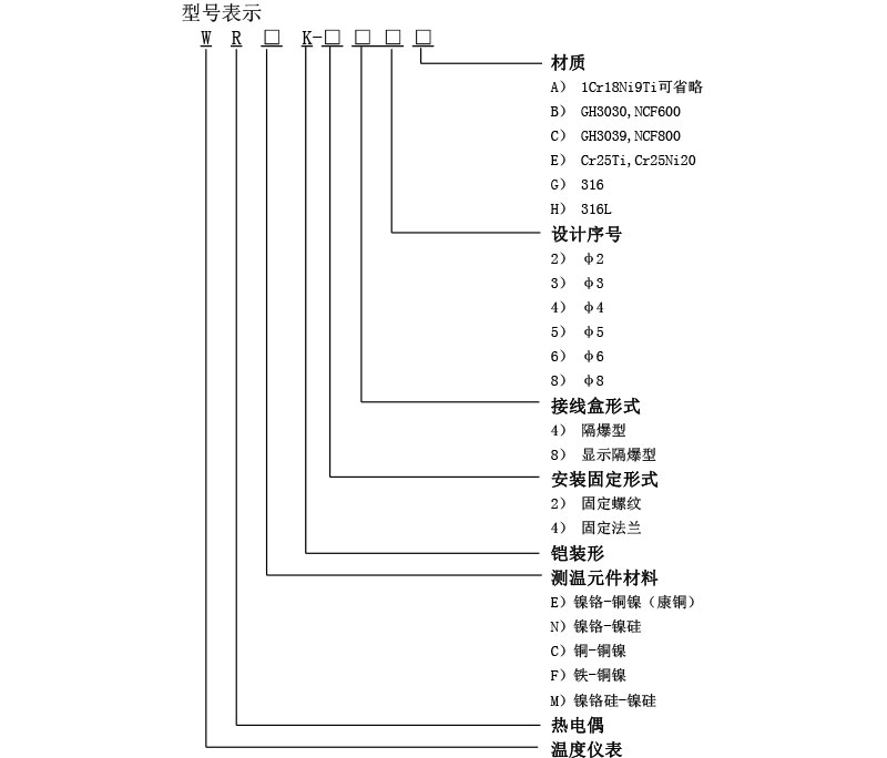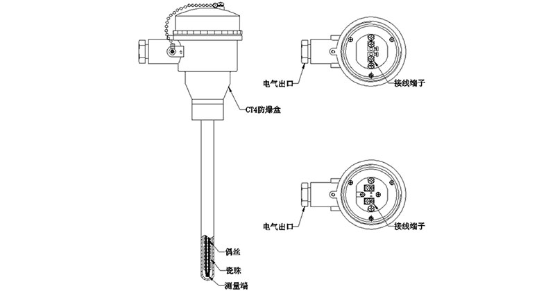 隔爆热电偶与装配式热电偶的结构、原理基本相同,所区别的是,隔爆型产品接线盒(外壳)在设计上采用防爆特殊结构,接线盒用高强度铝合金压铸而成,井具有足够的内部空间、壁厚和机械强度,橡胶密封圈的热稳定性均符合国家防爆标准。所以,当接线盒内部的爆炸性混合气体发生爆炸时,其内压不会破坏接线盒,而由此产生的热能不能向外扩散、传爆。