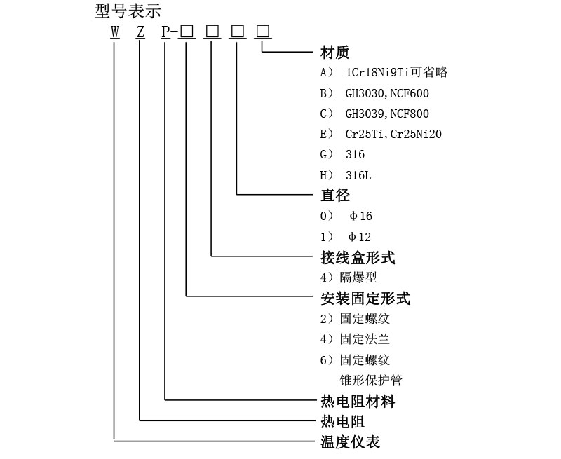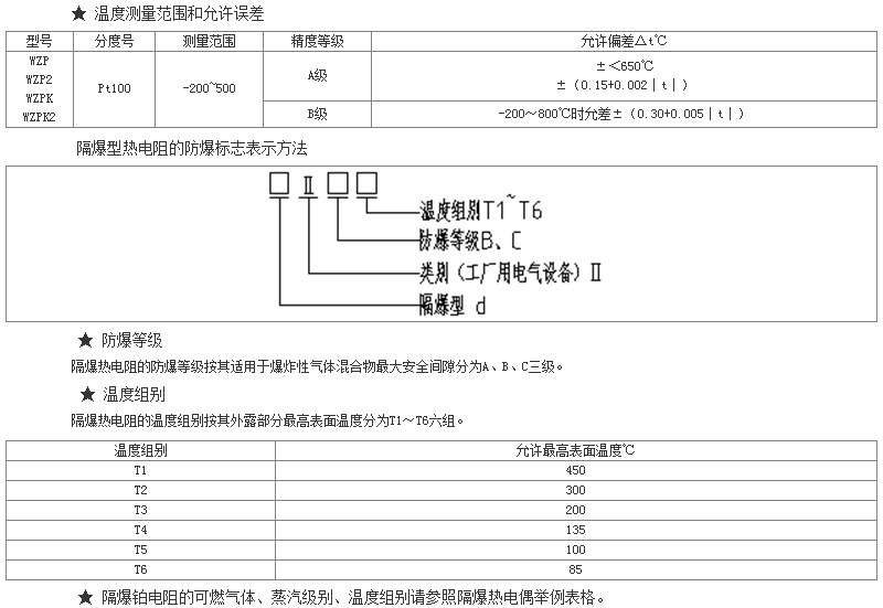 隔爆热电阻和装配式热电阻的结构,原理基本相同,所区别的是隔爆型产品的接线盒(外壳)在设计上采用防爆特殊的结构,接线盒用高强度铝合金压铸而成,并具有足够的内部空间、壁厚和机械强度、橡胶密封圈的热稳定性符合国家防爆标准,所以,当接线盒内部的爆炸性混合气体发生爆炸时,其内压不会破坏接线盒,而由此产生的热能不能向外扩散、传爆。由于产品采用上述防爆特殊结构,使产品完全符合使用在dⅡBT4或dⅡCT6防爆温度级别区间范围内,只要用户严格遵守产品使用规则,产品就能达到可靠的防爆效果。