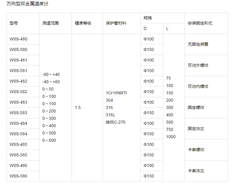 双金属温度计选型须知:请提供型号、表盘直径、精度等级、安装固定形式、测温范围、保护管材质、长度或插入深度。选型举例:万向型双金属温度计,表盘直径Φ100,测温范围0~400℃,1.5级,活动外螺纹M27×2,长度450mm WSS-481, 0~400℃,L=450, M27×2,1.5级