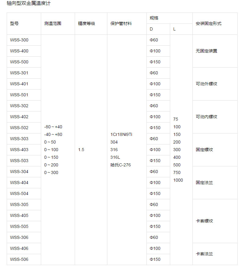 双金属温度计选型须知:请提供型号、表盘直径、精度等级、安装固定形式、测温范围、保护管材质、长度或插入深度。选型举例:万向型双金属温度计,表盘直径Φ100,测温范围0~400℃,1.5级,活动外螺纹M27×2,长度450mm WSS-481, 0~400℃,L=450, M27×2,1.5级