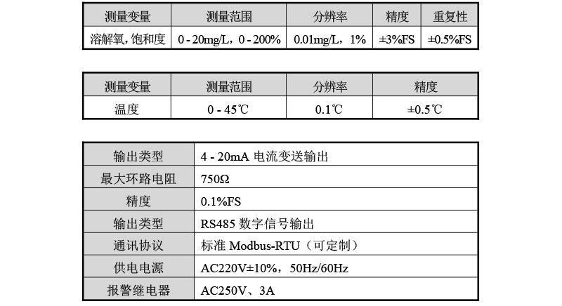 ●采用 2.8 寸 128*64 点阵屏 ●采用隔离变送输出,干扰度更小 ●采用隔离 RS485 通讯 ●可进行 DO/SAT 的测量、温度测量、上下限控制、变送输出、RS485 通讯 ●可设置高、低报警功能,及迟滞量 ●可设置蜂鸣器、液晶背光开关功能 ●可选择语言,目前支持中文和英文 ●可进行空气标定
